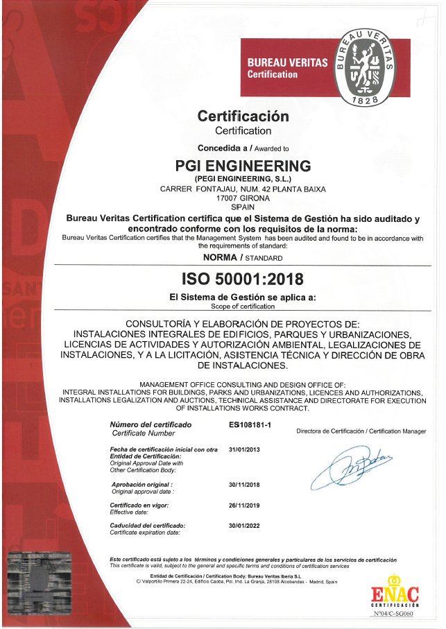 PGI Engineering & Consulting est cerifiée avec: ISO 9001, ISO 14001 , ISO 50001, ISO 19650, ISO 27001 (Succursale de Girona)